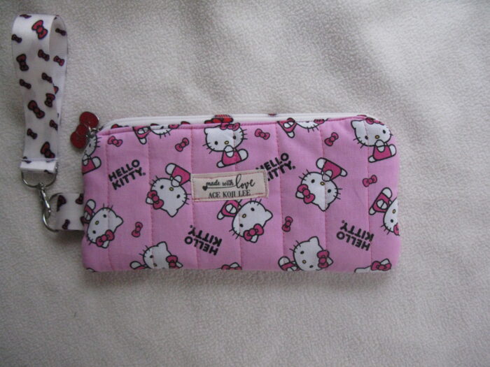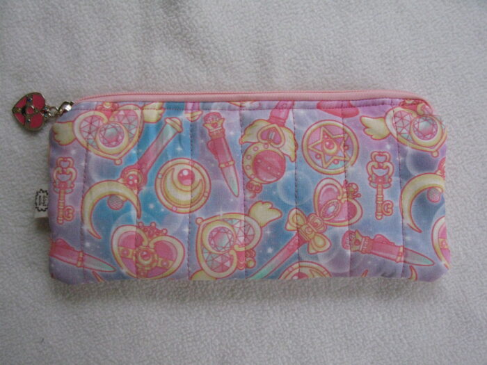 Made 3 of the Hello Kitty and 1 of the Magical Girl. Hello Kitty pencil case has a bow zipper pull, bows zipper tape, and bows wrist strap. The magical girl pencil case has a Sailor Moon locket zipper pull.